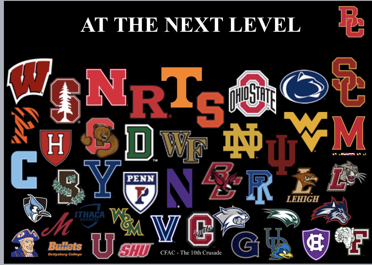 TEN CRUSADERS ANNOUNCE COLLEGE INTENTIONS AT HOEHL GYM FEBRUARY 7 – ORADELL, NJ – Ten of Bergen Catholic’s finest announced their academic and athletic intentions when they graduate in 2024. Here is a quick rundown of the students. Student-Athlete College Sport Michael Del Union College Baseball Luke Dellentash Stonehill College Baseball Billy Nichols Colby College Baseball Michael Delpome Franklin & Marshall College Football Owen Fernandez Union College Football Christian Gonzalez Columbia University Football Anthony Morales Rutgers University Football Ryder Hodgson Rutgers University Golf Andrew Blodgett Bucknell University Soccer Ken Hoang Vassar College Soccer Their choices demonstrate character and a commitment to their hard work in both the classroom and on the playing surface, whether it be a diamond, gridiron, pitch or course. The schools are some of the most competitive to enter. We thank them and their parents for partnering with BC to help to provide these opportunities for them.